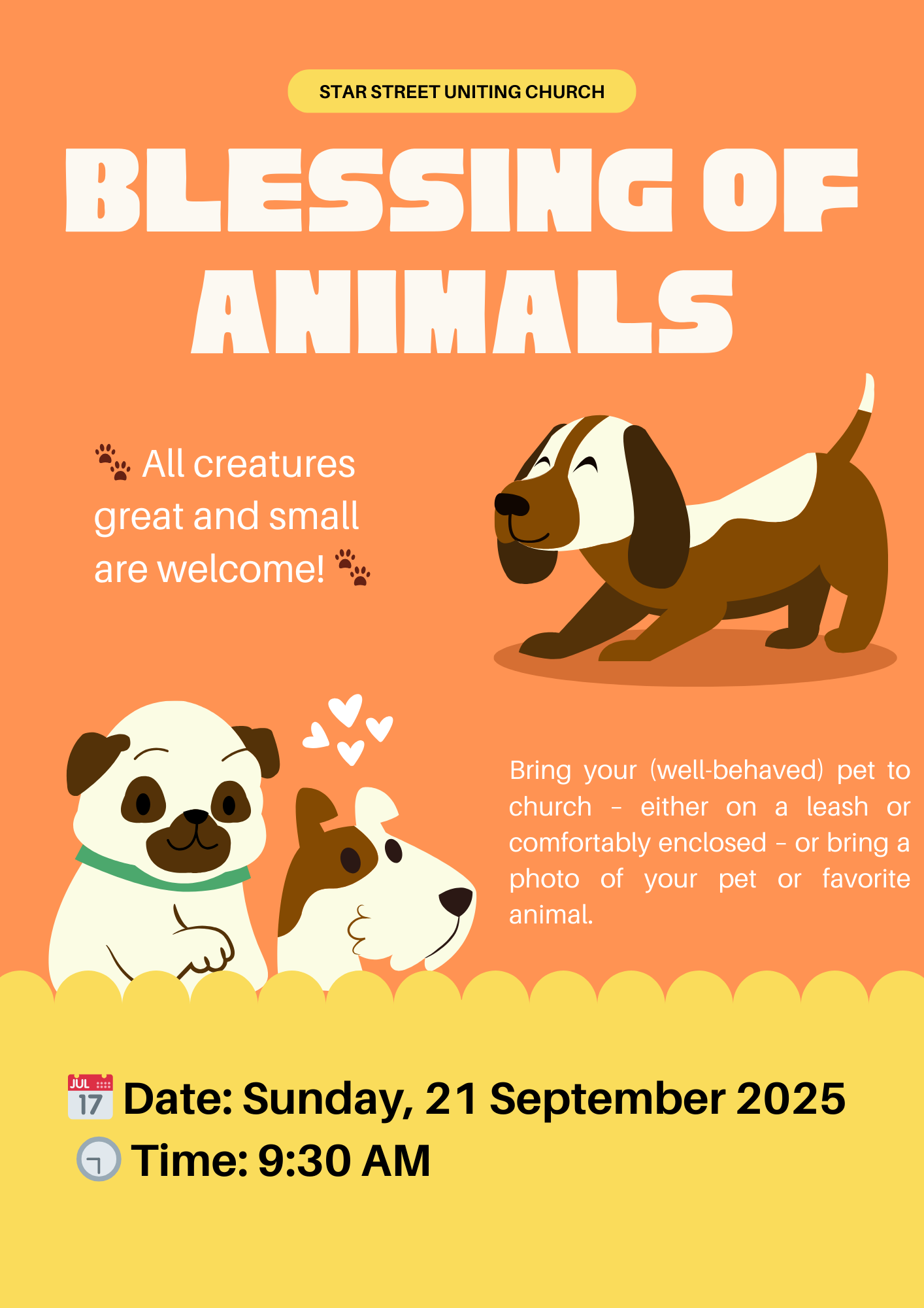 BLESSING OF THE ANIMALS on 21st September. Bring your (well-behaved) pet to church – either on a leash or comfortably enclosed – or bring a photo of your pet or favourite animal.